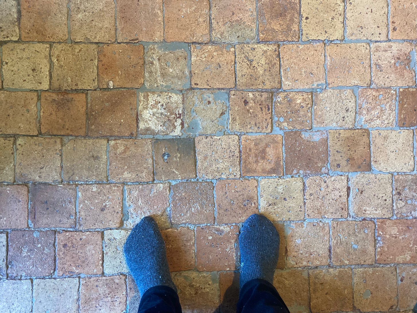 I am now ensconced in my garret, sheltered under slanted walls that are framed by wooden beams hoisted into place almost 400 years ago. Its floor is of square brick tiles—so solid under my feet, so abiding—each crafted from clay dug out of the earth somewhere not far from here, each its own wonder of ding, splotch, and hue.